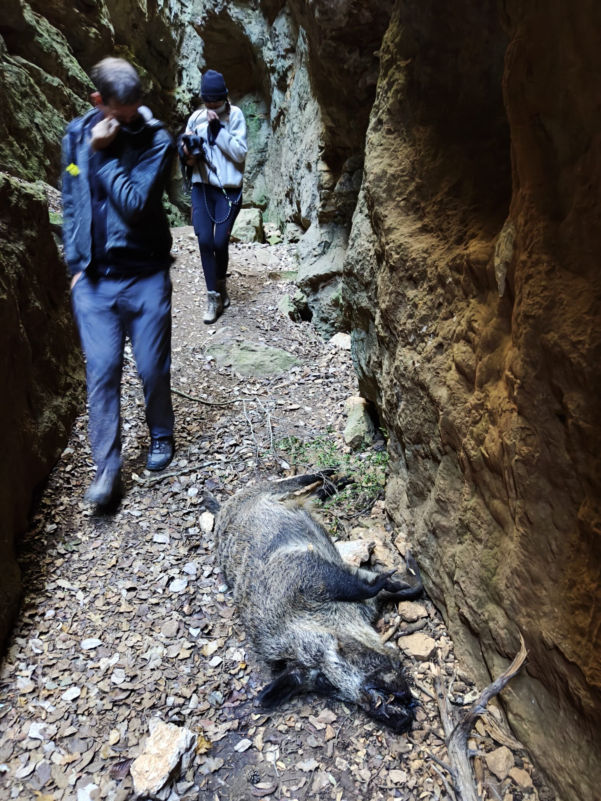 De kloof zelf is behoorlijk uit de kluiten gewassen, toch wel 30 meter diep. Je moet dus wel opletten als je bovenaan de kloof loopt, langs het pad dat je naar beneden leidt. Die les heeft een zeer onfortuinlijk everzwijn gemist… Die lag er al even en dat hebben we geroken.