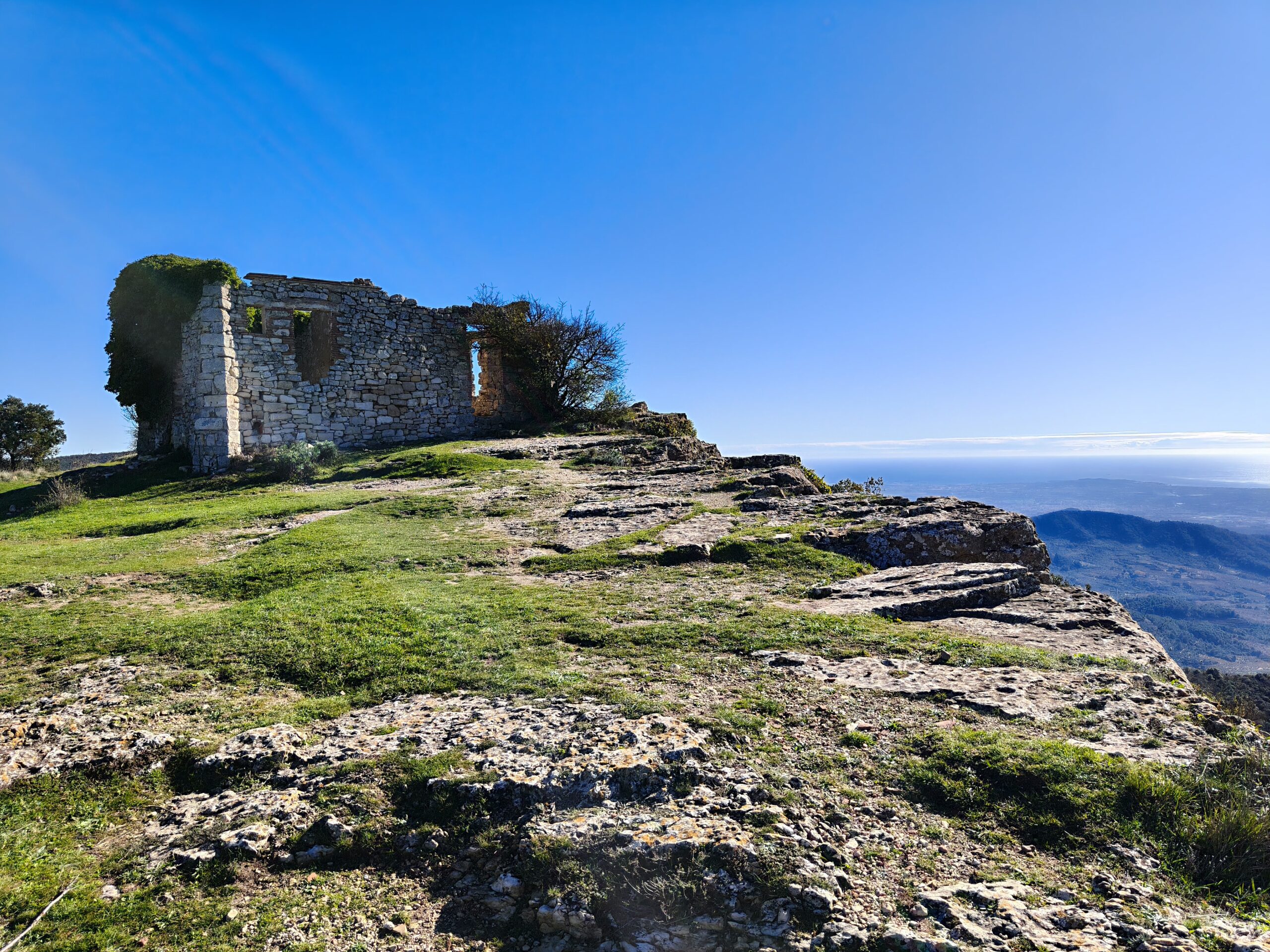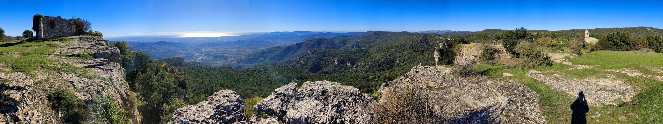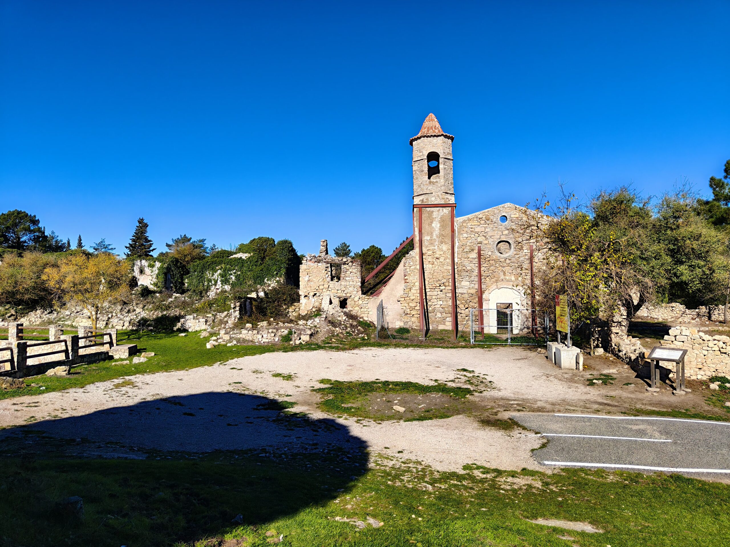 Toen we terug wandelden, stond het zonnetje al wat hoger aan de hemel en konden de jassen snel uit. Op een paar honderd meter van onze campers bevindt zich La Mussara, of wat ervan over blijft. Het dorpje dateert al van in het bronzen tijdperk maar werd rond 1960 officieel als verlaten beschouwd, mede door de industrialisering en het harde klimaat. Vandaag blijven enkel nog een gestutte kerktoren en enkele gebouwen getuige van de plek. Ook best een winderig gat, maar het uitzicht is ook hier fenomenaal. Ik had enkel de smartphone bij op wandeling. Die deze keer niet overdreef in nabewerking…