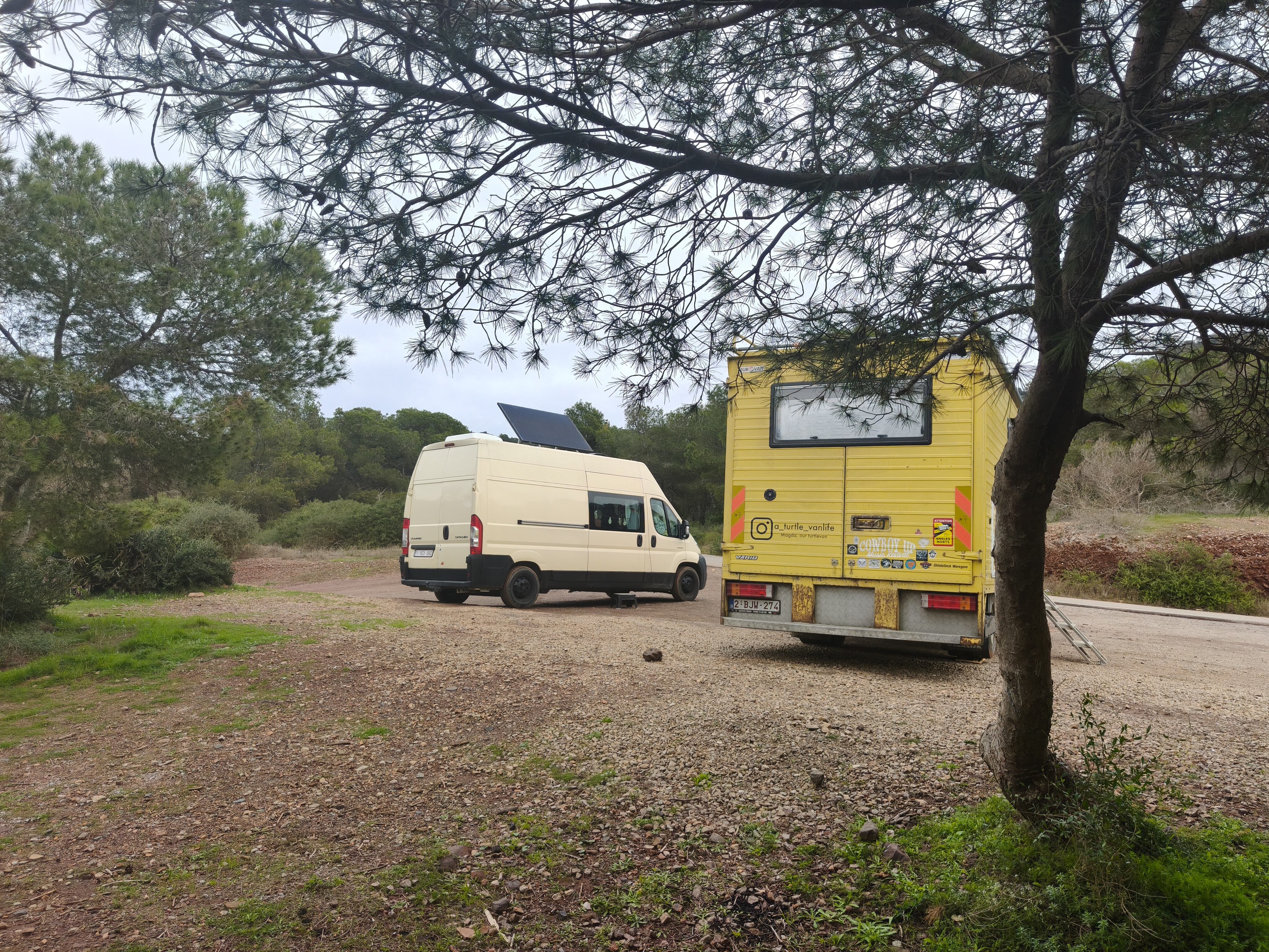 We staan de eerste avond naast de weg die naar de kust en een bijhorende Chiringuito leidt (da’s Spaans voor strandbar). Op zich geen superdrukke weg, maar toch. We zakken stevig door die eerste avond. Forger wil de volgende dag de steile en zeer bumpy weg naar beneden rijden, om daar wat meer privacy te vinden. Ik heb er mijn bedenkingen bij, maar “me nen tracteur komde overal deur”, zegt Forger al lachend. Ik heb er mijn bedenkingen bij, maar denk dat onze Nigel het ook wel aankan. En in ’t slechtste geval: hij heeft een winch. Later op de avond komt er een Duitse paardenvan naast ons staan. We maken de dag erop kennis voor we naar beneden rijden: Max en Yuri uit Hamburg. Max maakt muziek op straat en ze zijn net vertrokken met hun van. Check zeker zijn Instagram eens. Toegegeven, we hadden ze misschien niet direct aangesproken maar Moya dacht daar anders over. Ook zij zakten mee af langs de hobbelige weg. Daar stonden we echt in de brousse en konden we iets meer ‘campinggedrag’ aan de dag leggen: Stoeltje buiten en zonnebril op de snoet.