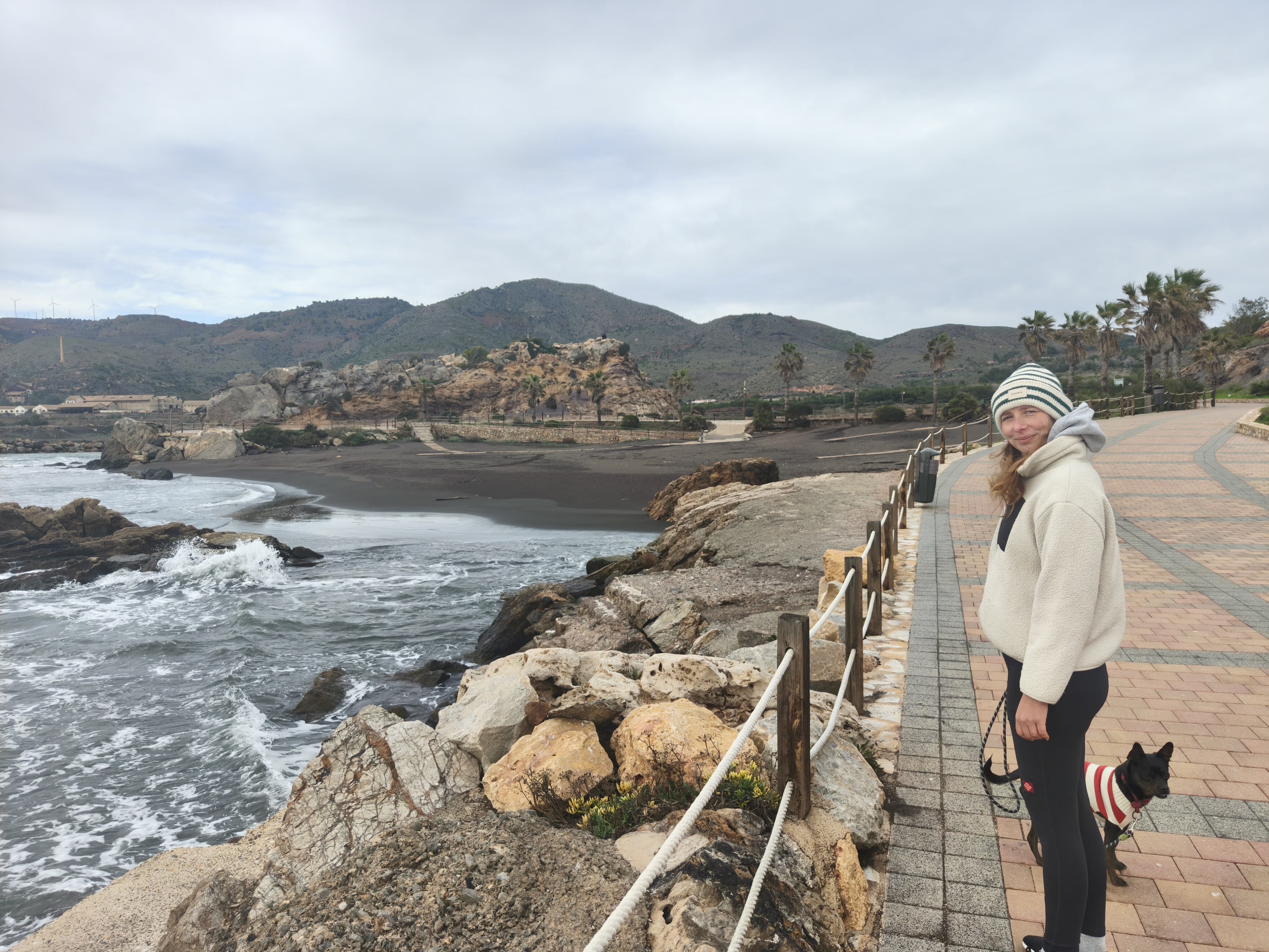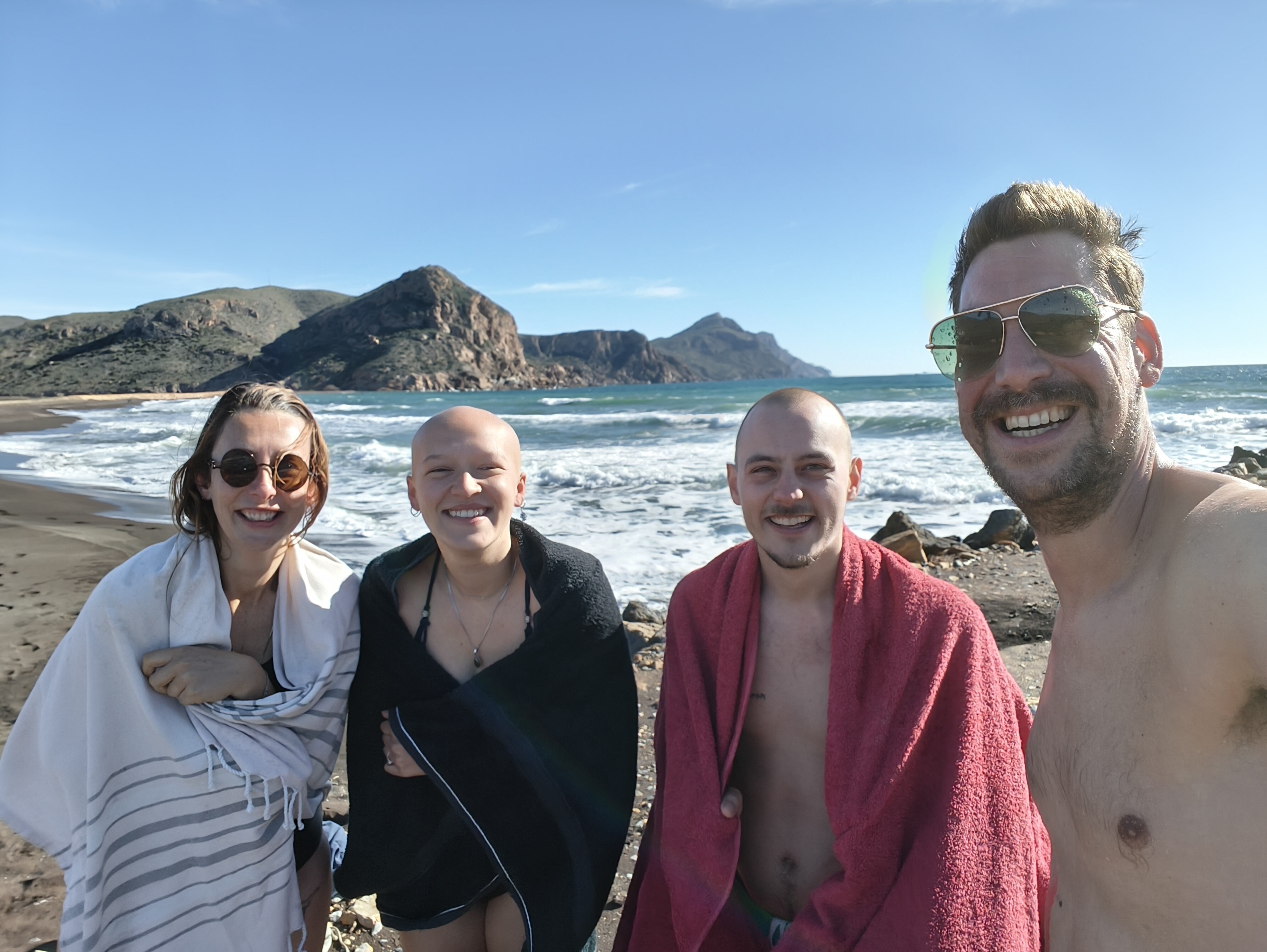 Eén dag later, en Nikki heeft een challenge bedacht: een frisse duik in de zee. Terwijl Owen en Forger met de (schoon)familie die op bezoek is, wat gaan eten, wandelen we samen met Max en Yuri richting het strand. Iets verderop zit een groepje Spanjaarden te aperitieven op strandstoelen, ingeduffeld met dikke jassen, en aan de andere kant 2 vissers, ook met dikke jas aan. Toen wij in onze zwembroek het water ingingen, dachten ze waarschijnlijk dat we gek waren. Het was inderdaad behoorlijk koud – maar blij dat we er even in geweest zijn.