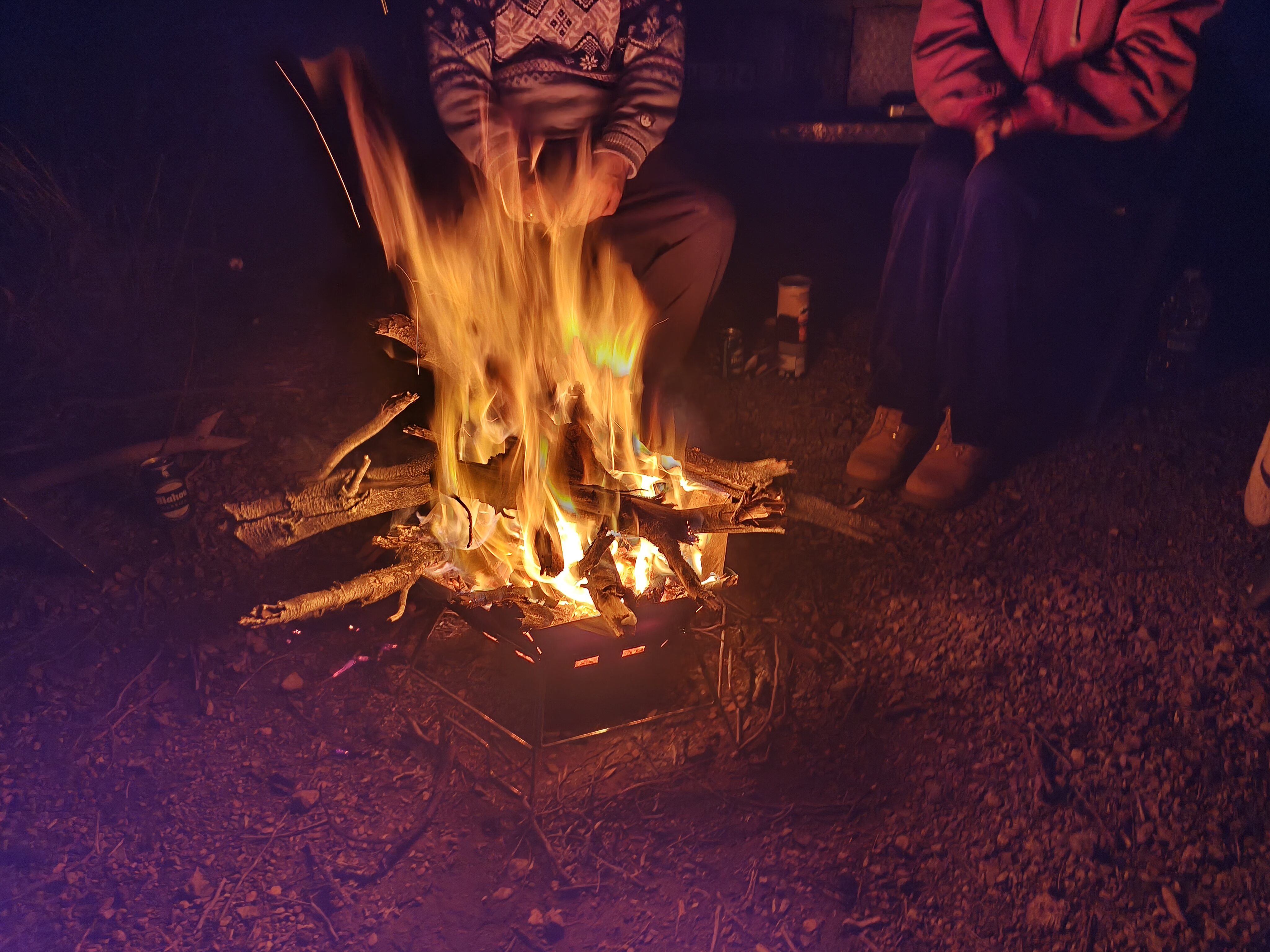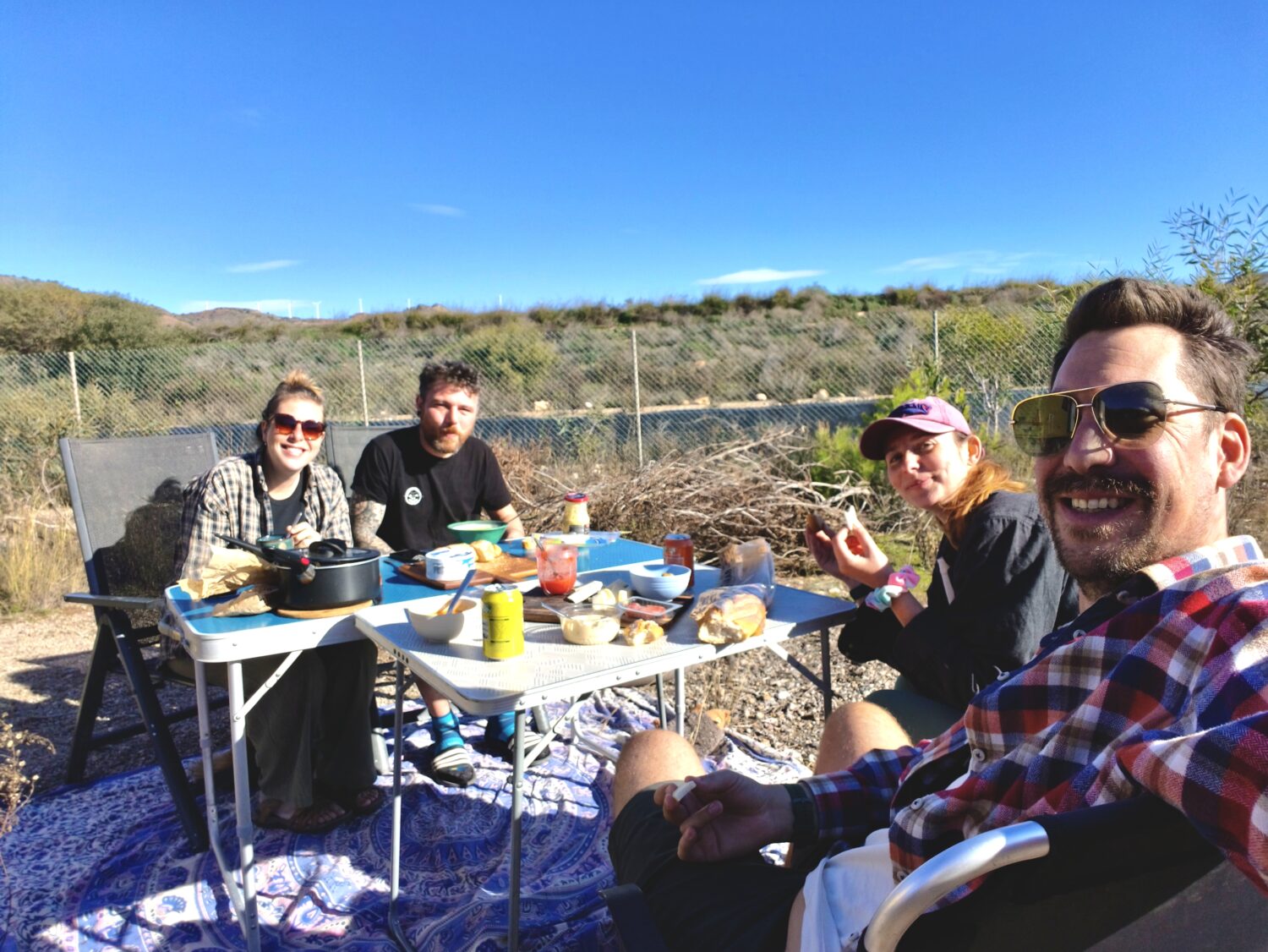 Toen de zon weer grezakt was in de zee werd het natuurlijk behoorlijk koud. Owen en Forger toverden een kleine vuurschaal uit het gat van hun turtle en Max en Forger gingen houd sprokkelen. Ik was eerlijk gezegd een beetje skeptisch en dacht dat er wel iemand een probleem van zou maken. Maar nee, het is nog steeds Spanje en dingen in de fik steken is een nationale sport (behalve in brandgevoelige nationale parken – dat vinden ze niet geestig). Enfin, het werd een enorm gezellige avond rond het kampvuur.