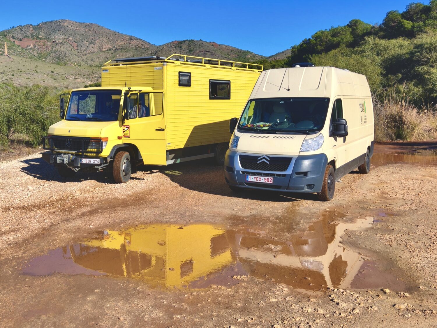 Samen met Owen, Forger (vanaf nu: de turtles) en Magda, hun ’turtlevan’ rijden we naar Portmán. Een vissersdorp dat een mijnstadje werd. De gele Mercedes Vario van 2013, 7.5 ton met laadbak lijkt inderdaad – met een beetje verbeelding – op een schildpad. De Turtles hebben hun leventje in België gecanceld en leven nu full-time in hun truck. De ruime laadbak werd vakkundig omgetoverd in een ruime leefruimte met goed uitgeruste keuken, bed, aparte badkamer met toilet en douche. Heel gezellig om volk in uit te nodigen dus die zelf niet veel extra zitplaats hebben 😛.